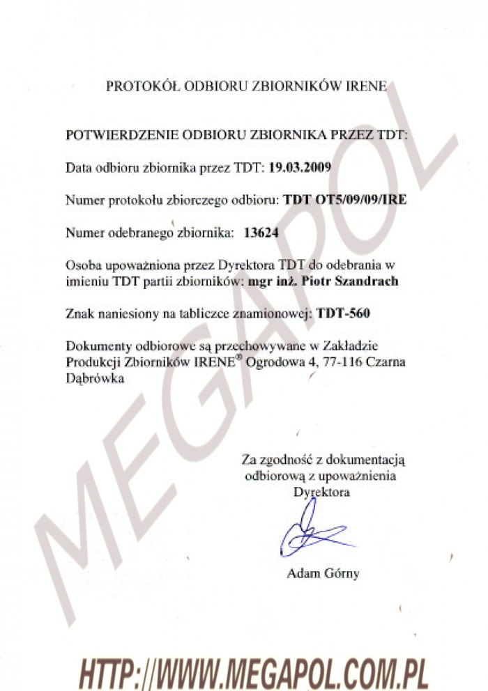 3. Dokument badania - odbioru / homologacja zbiornika - 1 sztuka ( zdjecie dokumentu - jako wzór)