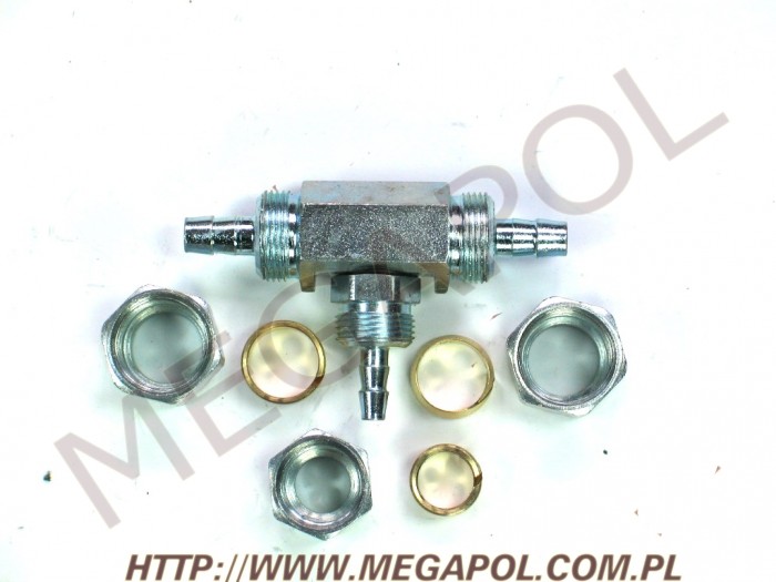 Samochodowe instalacje gazowe. Do połączenia trzech odcinków rury PCV do lpg. Łączenie rury PCV odbywa się poprzez nałożenie docisku baryłki na przewód PCV nastepnie baryłki ciętej i dociśnięcie /dokręcenie docisku do korpusu złącza. Poprzez dokręcenie docisku baryłka zaciśnie się na przewodzie PCV i jednocześnie na korpusie powodując trwałe uszczelnienie.