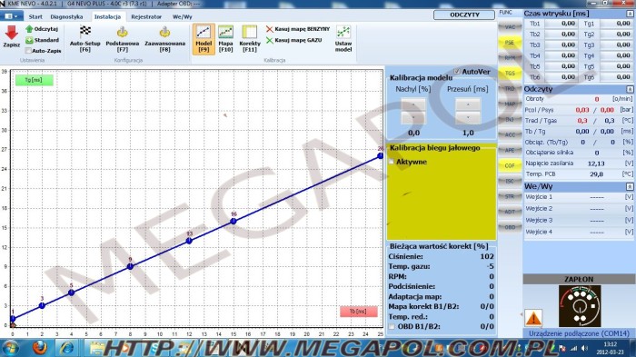 - czas wtrysku benzyny i gazu, obroty silnika, temperatura reduktora i gazu, podcisnienie, cisnienie, napiecie zasilania